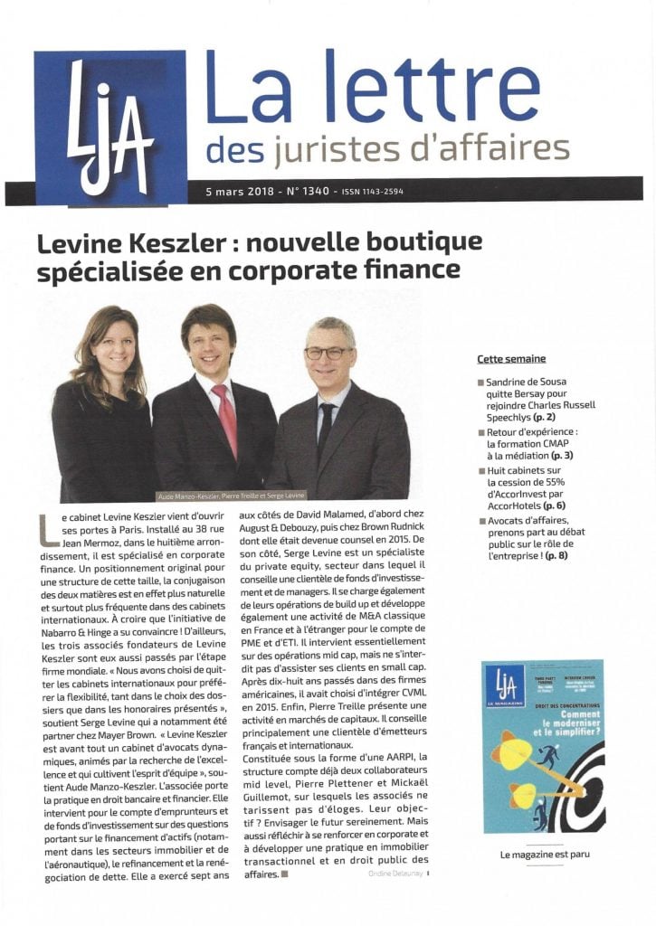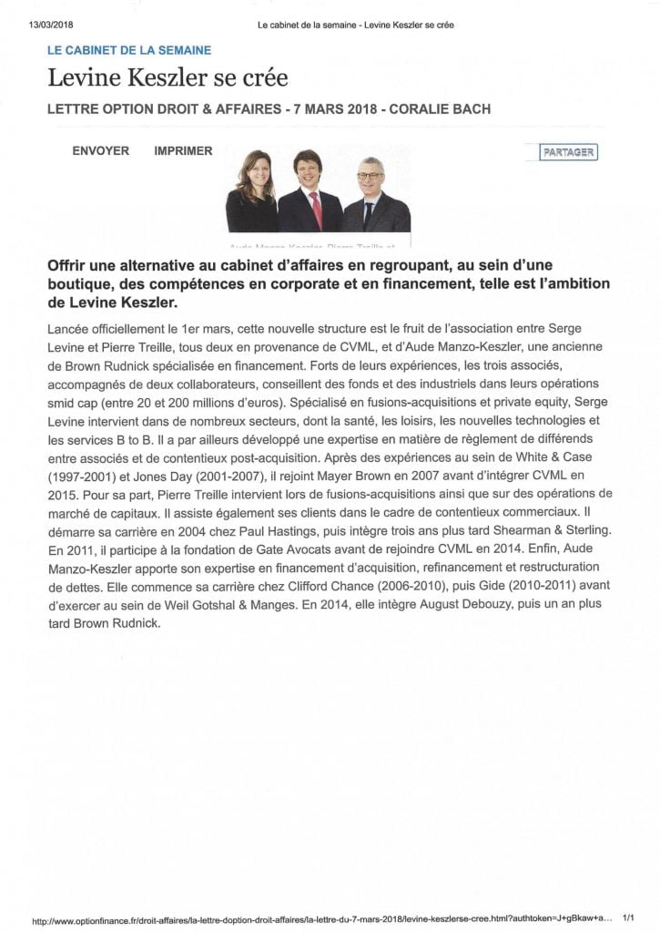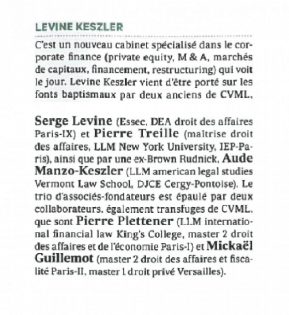 Pierre Treille founded Levine Keszler in 2018 after practicing at CVML, Gate Avocats, Shearman & Sterling and Paul Hastings.